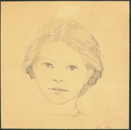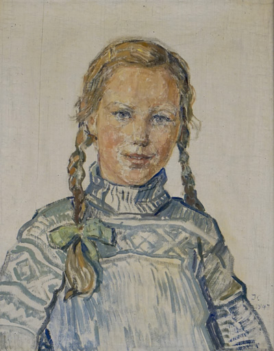 Portræt af ung pige – sandsynligvis Eva Signeret I C 1928. Bredde 24 cm, højde 49 cm Malet af Ingeborg Clausen, født Brandt.