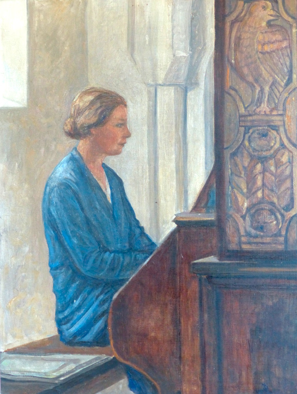 Datteren Benedicte Aidt, født Clausen, ved orglet i Ollerup Kirke, hvor hun var organist i årene 1927-1932. Bredde 66 cm, højde 77 cm. Cirka 1930. Malet af Ingeborg Clausen, født Brandt. B009