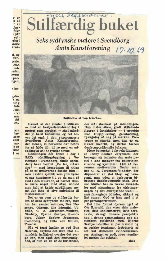 Det er en pæn og stilfærdig buket af seks sydfynske malere, man her har samlet sammen, Eva Naschau, Ollerup, Ole Bjørnild, Ulbølle, C. A. Jørgensen-Vindeby, Vindeby, Bjarne Saabye, Svendborg, Johny Saabye Jørgensen, Svendborg, og Otto von Milllen, Troense.