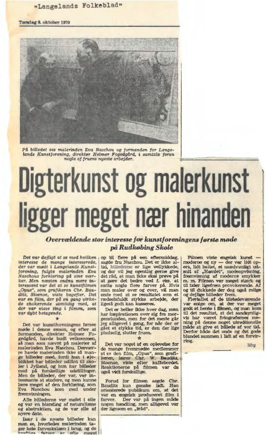 “Det var kunstforeningens første møde i denne sæson, og efter at formanden, direktør Helmer Fogedgård, havde budt velkommen, så man som nævnt på malerier af malerinden Eva Naschou. Desværre havde malerinden ikke så mange billeder med, fordi hun i øjeblikket har billeder udlånt til skoler i Jylland, og hun har billeder med på forskellige udstillinger. Men de bilileder, der var, var interessante at studere, og man kunne lære meget af den forklaring, som Eva Naschou kom med under fremvisnigen.